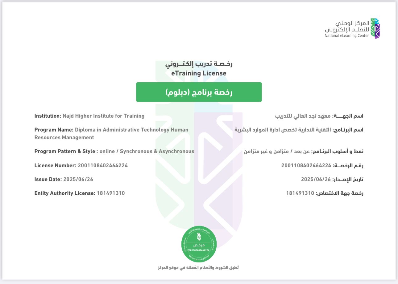 إن الحصول على هذه الرخصة من المركز الوطني للتعليم الإلكتروني يعدّ دليلاً واضحاً على التزام المعهد بأعلى معايير الجودة في تقديم البرامج التدريبية عن بعد، ويمنح البرنامج شرعية واعتمادًا رسميًا يُطمئن المتدربين والجهات الحكومية والخاصة على حدٍ سواء.